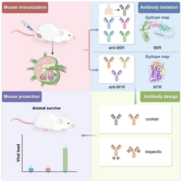 前期,研究团队在天花疫苗接种者体内,鉴定出两株靶向胞外囊膜型表面抗原B6R的单克隆抗体,其在动物模型中表现出显著的抗病毒效果。近期,团队进一步探讨了胞内成熟型表面抗原M1R、胞外囊膜型表面抗原B6R诱发抗体的免疫学特征。通过抗原mRNA疫苗免疫小鼠,结合单细胞测序技术,团队筛选大量针对M1R与B6R的单克隆抗体,绘制出表位和功能图谱。多株抗体展现出高效中和活性,并在多种动物模型中验证了保护效果。研究表明,M1R和B6R抗体鸡尾酒疗法能够增强抗病毒效果,M1R/B6R双特异性抗体在小鼠模型中表现出优于鸡尾酒疗法的保护效能。