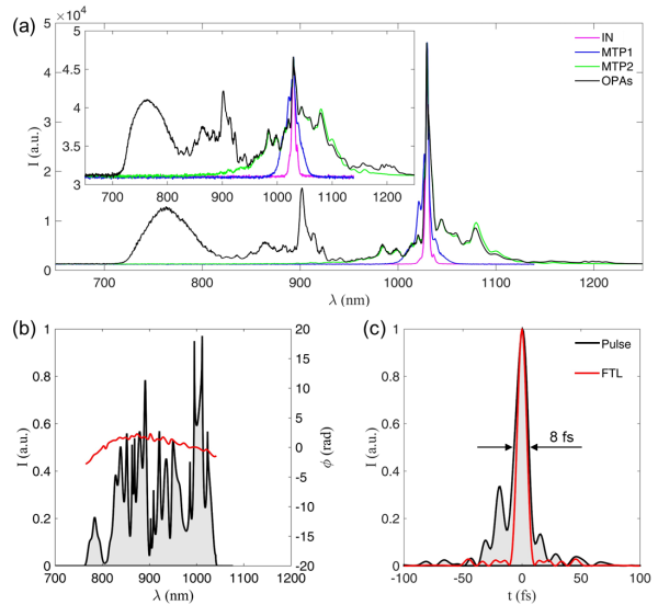 (a)光谱特性、Wizzler测量的(b)光谱相位和(c)压缩脉冲