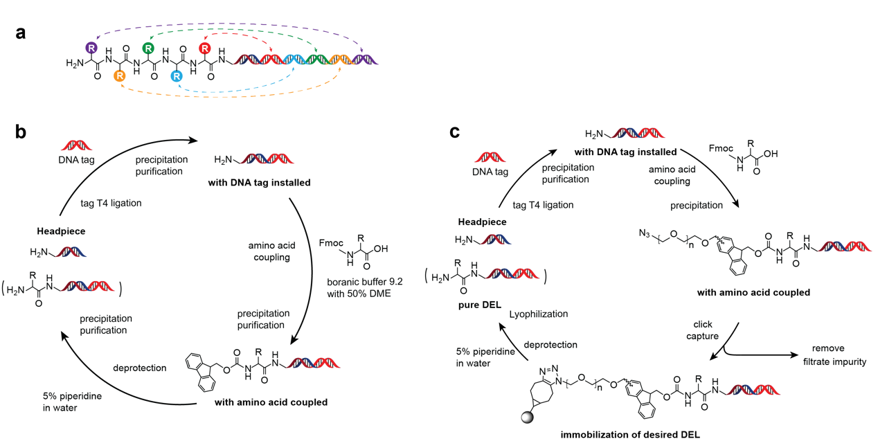 近年来,多肽类药物的有效性与安全性优势日益凸显,多种创新疗法已获批用于临床治疗。DNA编码多肽文库(PDEL)凭借高通量、操作简便、样品需求量低、筛选成本可控及流程高效等特点,在非天然多肽分子研究领域展现出独特优势,其通过化学合成,实现了多肽序列与DNA标签的共价偶联,突破了传统多肽展示技术的化学兼容性局限,并可灵活引入非天然氨基酸,拓展了多肽药物的设计与优化空间。然而,现有PDEL缺乏有效纯化手段,在文库长度、整体纯度及序列均一性方面存在明显不足。随着多肽长度增加,Fmoc氨基酸与DNA偶联过程中的未反应原料及副产物逐步累积,截短肽与非目标序列比例升高且逐步占据主导,导致PDEL整体质量随长度增加而明显下降。这种质量劣化不仅降低筛选效率,还易引入大量假阳性、假阴性结果,干扰真实高亲和力配体的识别,进而增加高质量多肽分子的发现难度。