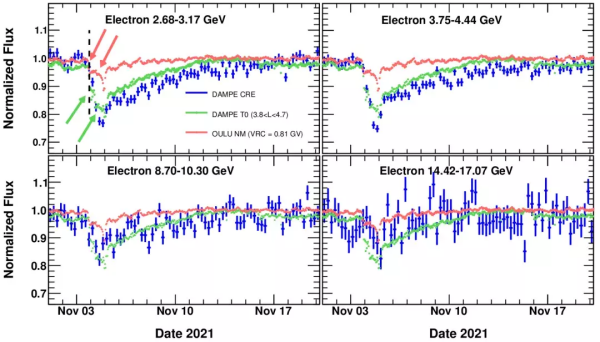 “悟空”号卫星观测的2021年11月4日福布斯下降事件4个能段正负电子流量随时间的变化(蓝点),与“悟空”号卫星无触发计数率(绿点),以及中子探测器数据(红点)的比较。