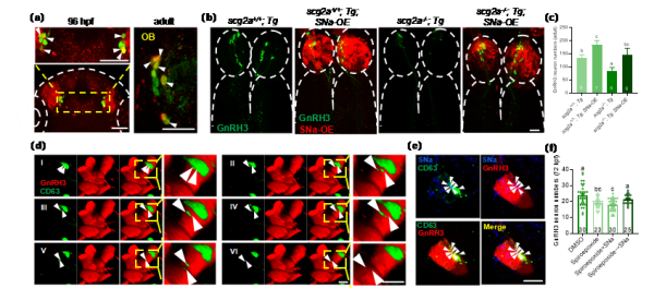 研究团队发现,scg2a阳性细胞与GnRH3神经元在脑内的分布存在密切关系。scg2a敲除导致GnRH3神经元数量明显降低,回补SNa可拯救突变体GnRH3神经元数量。活体激光共聚焦延时成像与外泌体分离鉴定发现,scg2a阳性细胞分泌的外泌体可运输SNa,并直接作用于GnRH3神经元,这表明SNa可通过外泌体递送实现神经系统的细胞间通讯,在调控GnRH3神经元发育中发挥关键作用。